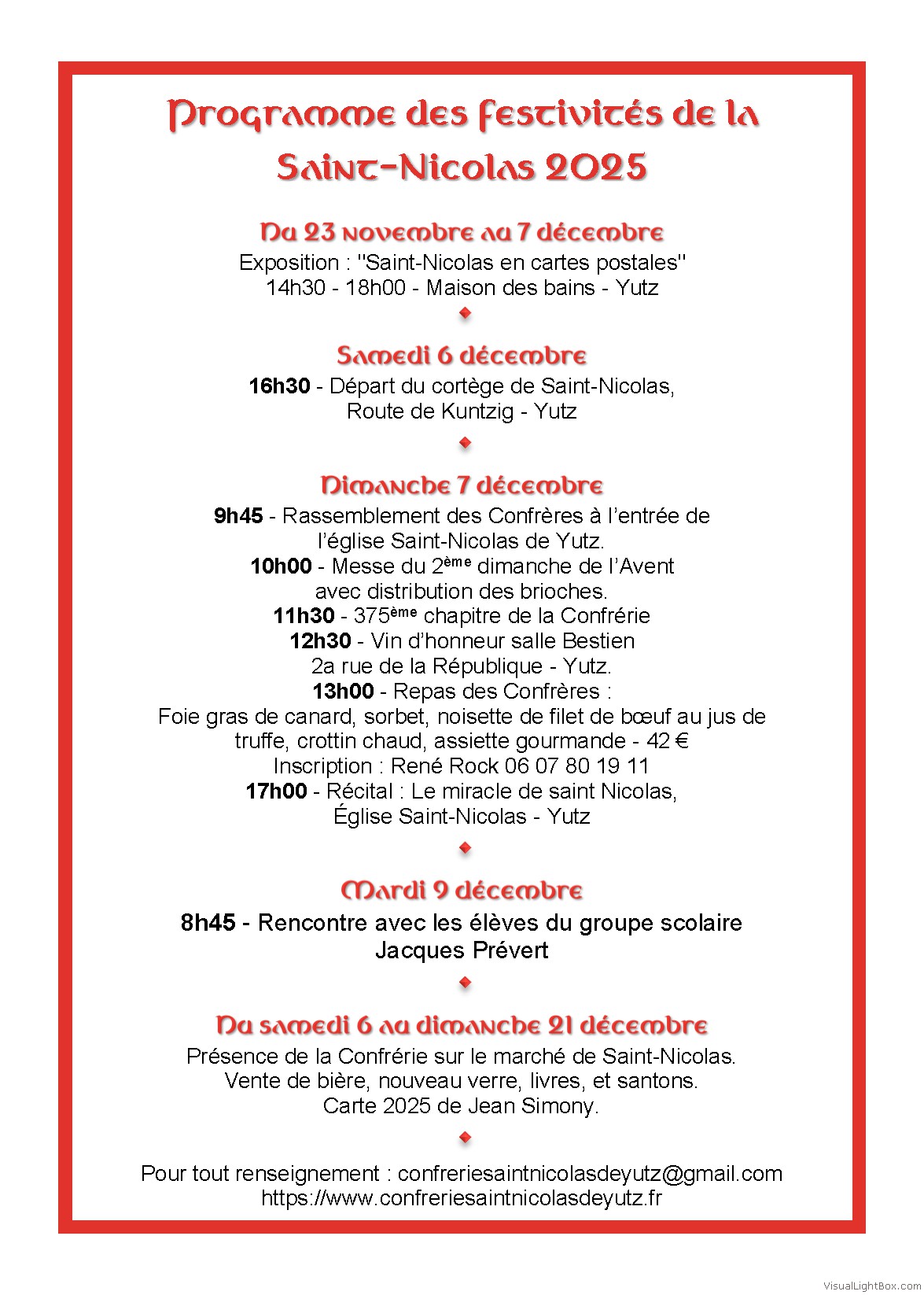 L'apéritif est offert par la Confrérie Saint-Nicolas de Yutz, la salle et le repas sont organisés par les Compagnons.